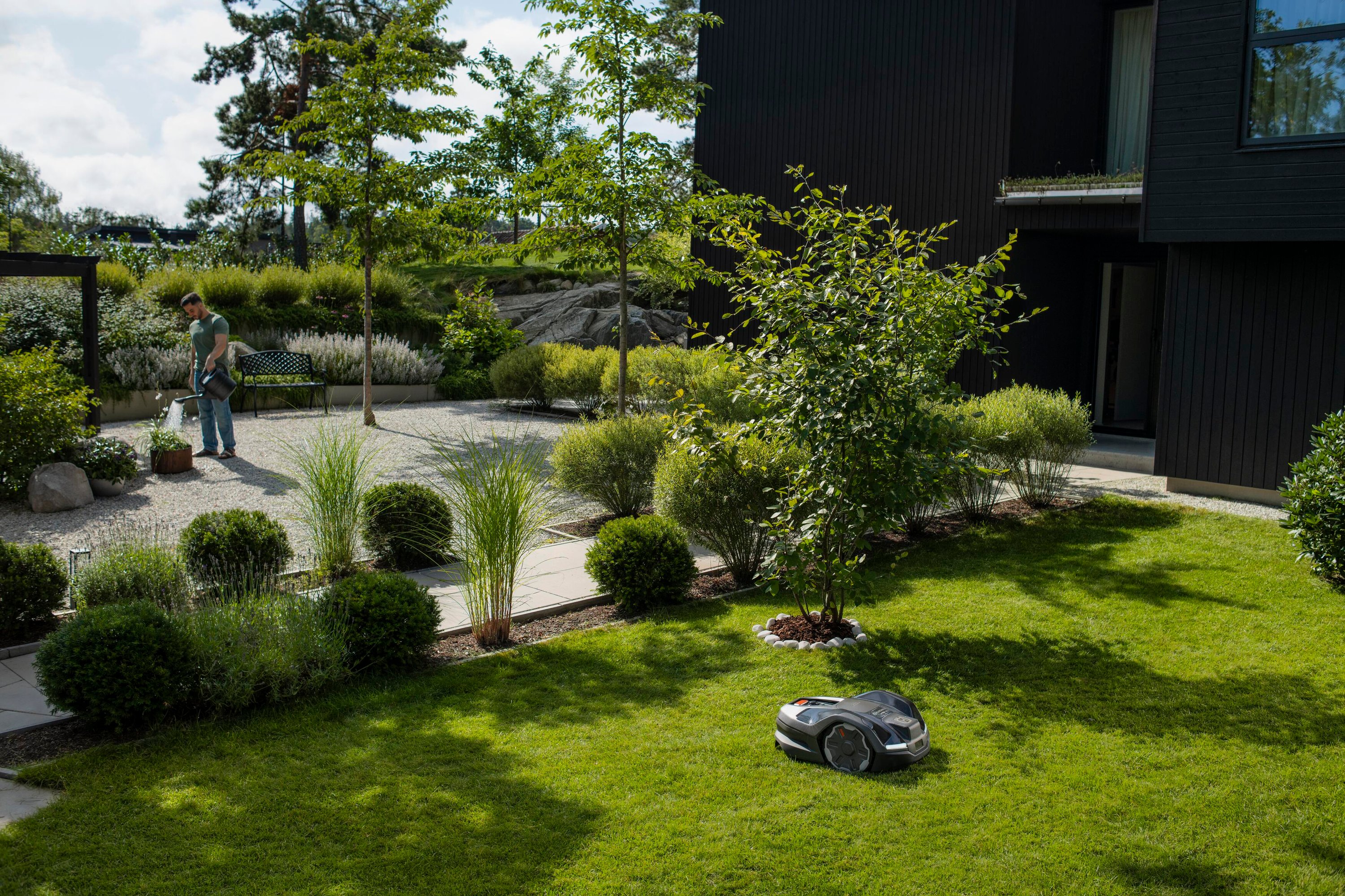 Sekačka Husqvarna Automower® umí svoji pracovní dobu přizpůsobit počasí, což znamená, že v době rychlého růstu trávy pracuje mnohem déle. Za slunečného a suchého počasí nebo ke konci sezóny seká kratší dobu - tím šetří trávník a zároveň se méně opotřebovává.