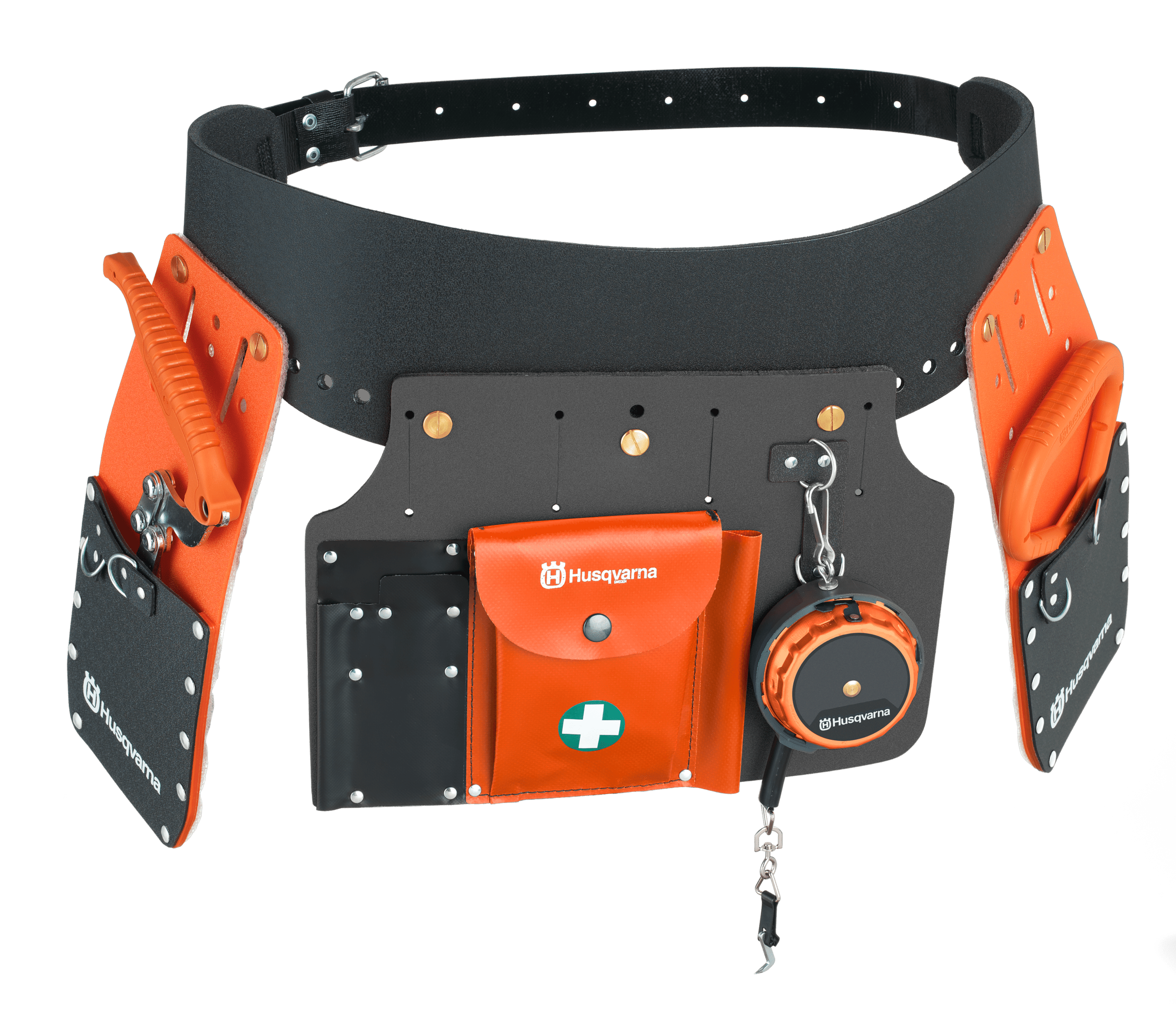 Kompletní opasek na nářadí v profilované krabici obsahuje opasek na nářadí, dvě pouzdra, zadní pouzdro na nářadí, zvedací hák, manipulační kleště a měřící pásmo.