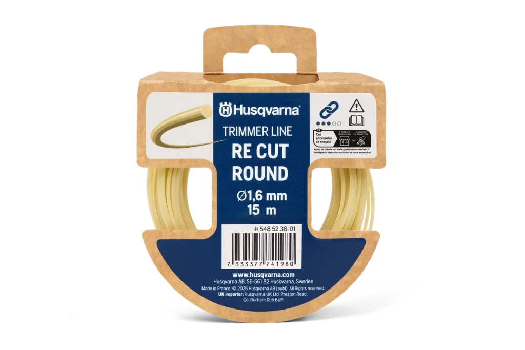 Vyžínací struna Husqvarna RE Cut vyrobená z materiálu Ultramid® B lowPCF*. Poskytuje stejnou odolnost a žací výkon jako tradiční struny a díky kulatému tvaru také snadnou manipulaci. Vhodná do všech standardních strunových hlav.*Více o materiálu Ultramid® B lowPCF najdete na stránkách BASF.